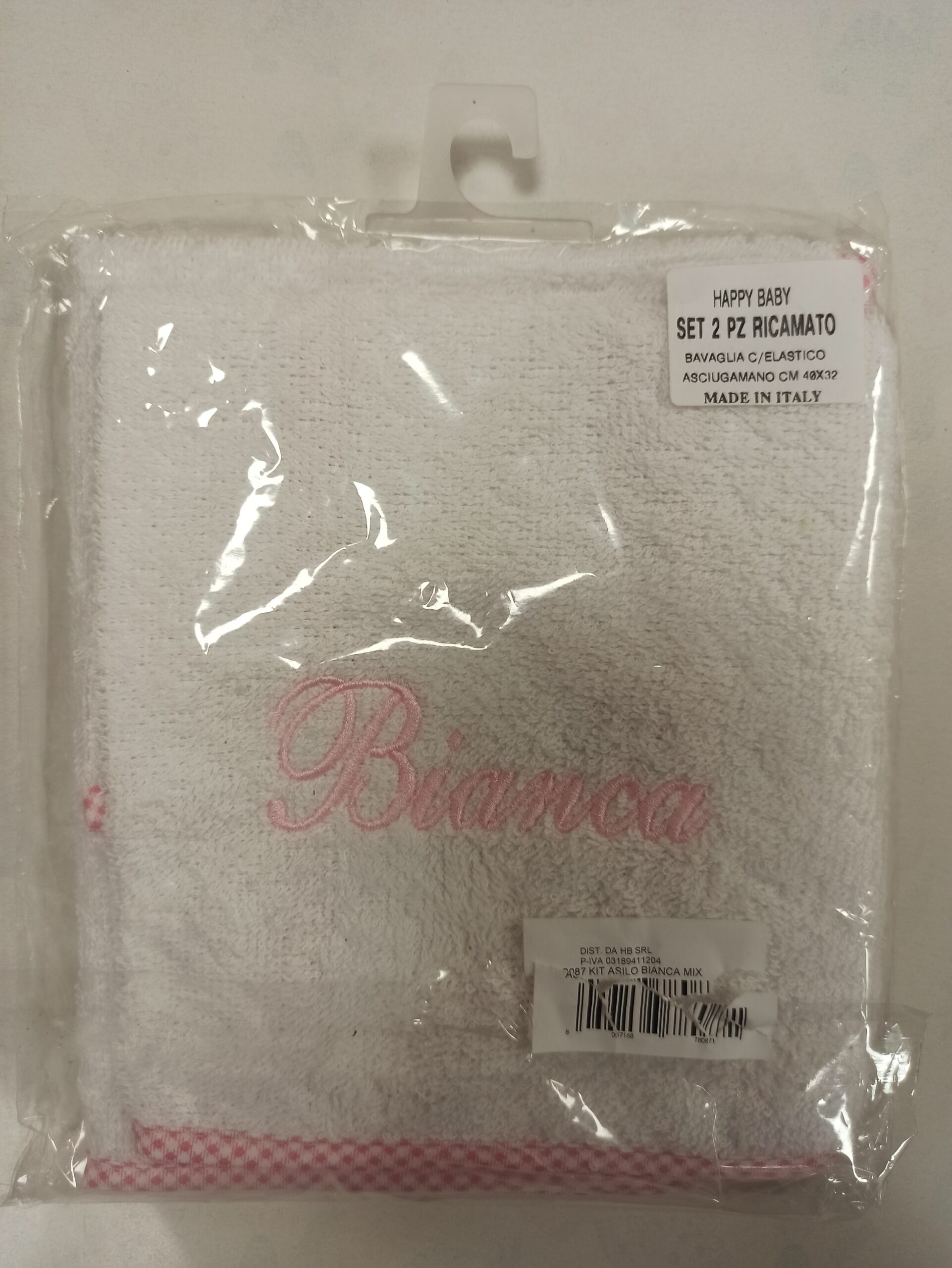 HAPPY BABY KIT ASILO BAVAGLIA CON ELASTICO E ASCIUGAMANO PERSONALIZZATI CON NOME BIANCA