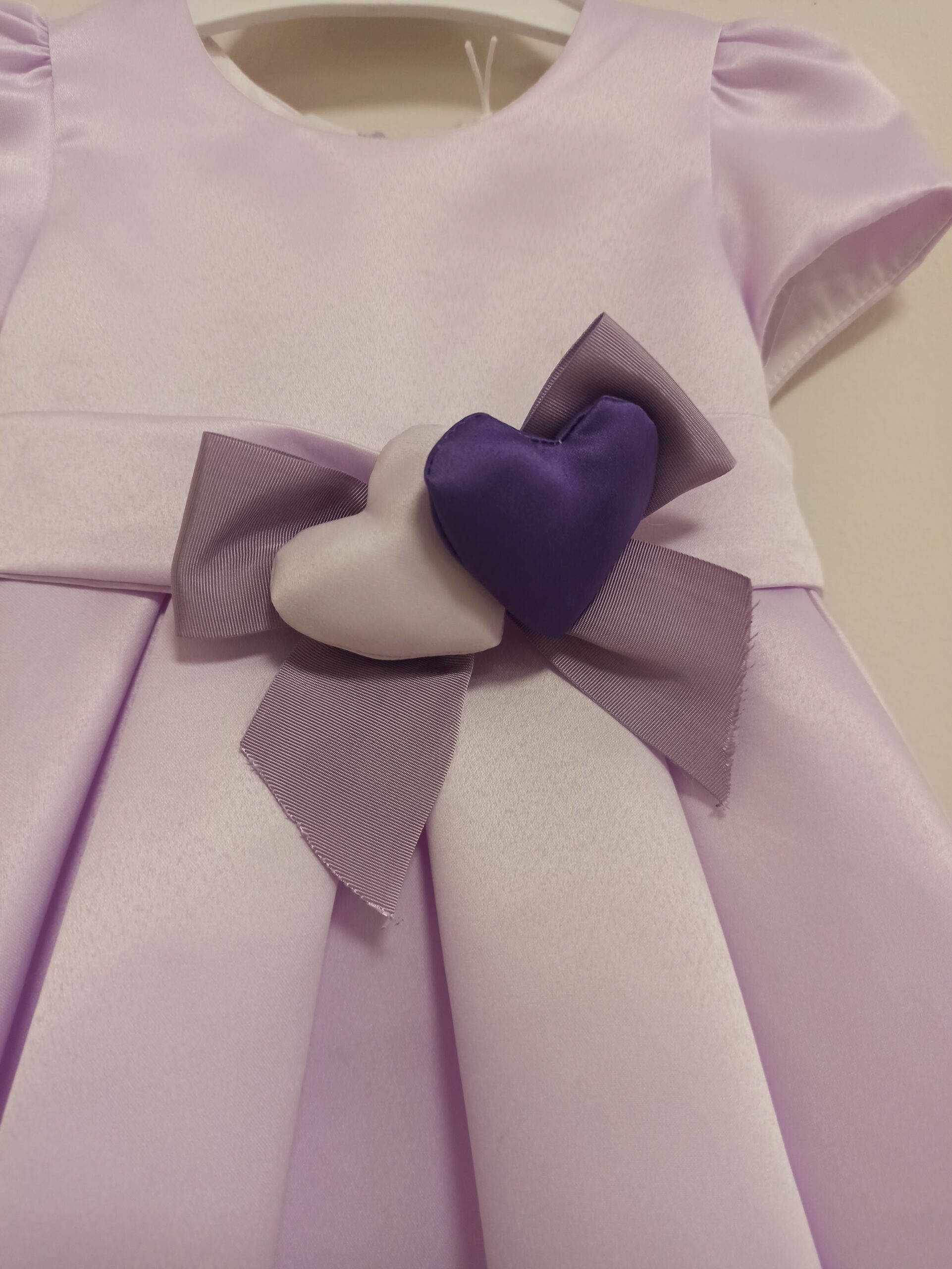 Vestitino colore viola con manica corta in raso con cinturina in vita con un fiocco e due cuoricini