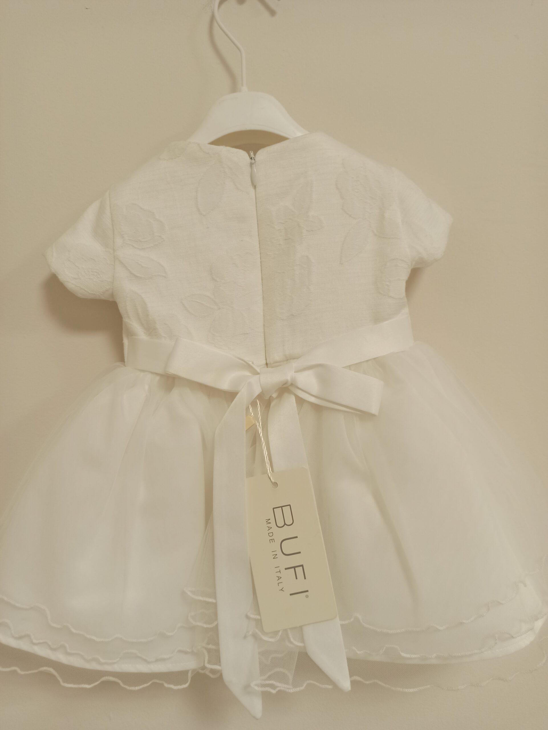 Vestitino a maniche corte color latte con corpetto ricamato a fiori e cinque roselline in vita. Gonna in raso con sopra tre strati di tulle.