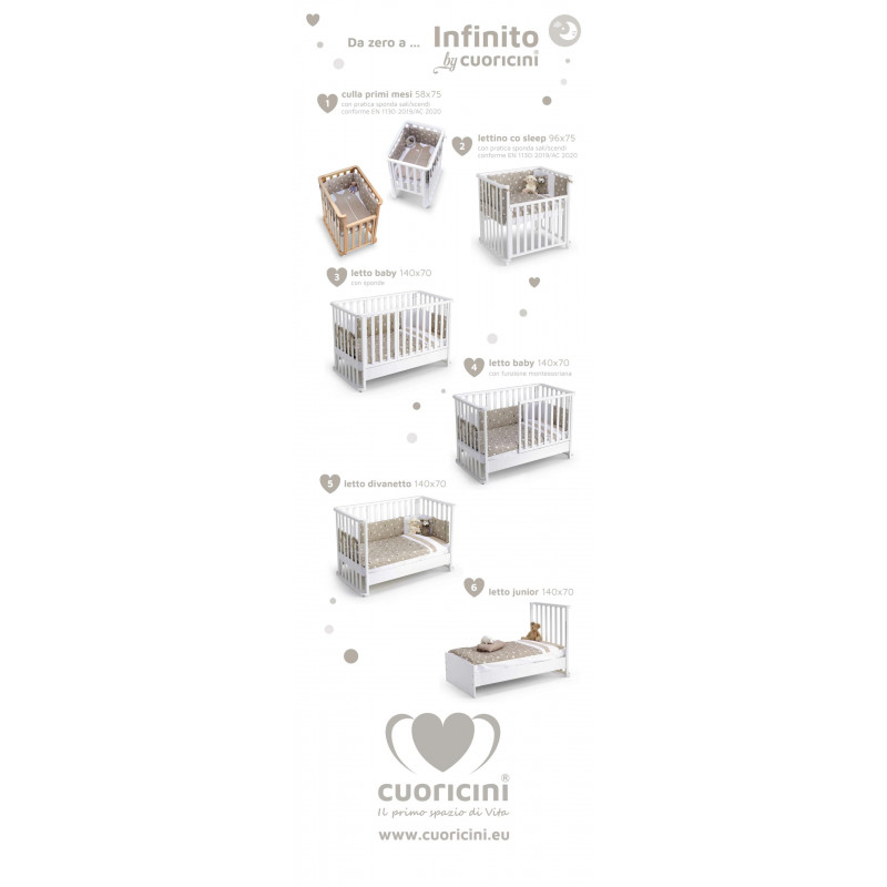 Lettino evolutivo Infinito di Cuoricini accompagnerà il vostro bimbo da zero all’infinito. Partendo dalla culla per i primi mesi, per poi passare ad un lettino co-sleeping, per trasformarsi in lettino standard da poter configurare in varie modalità ed infine arrivare ad un primo lettino Montessori.