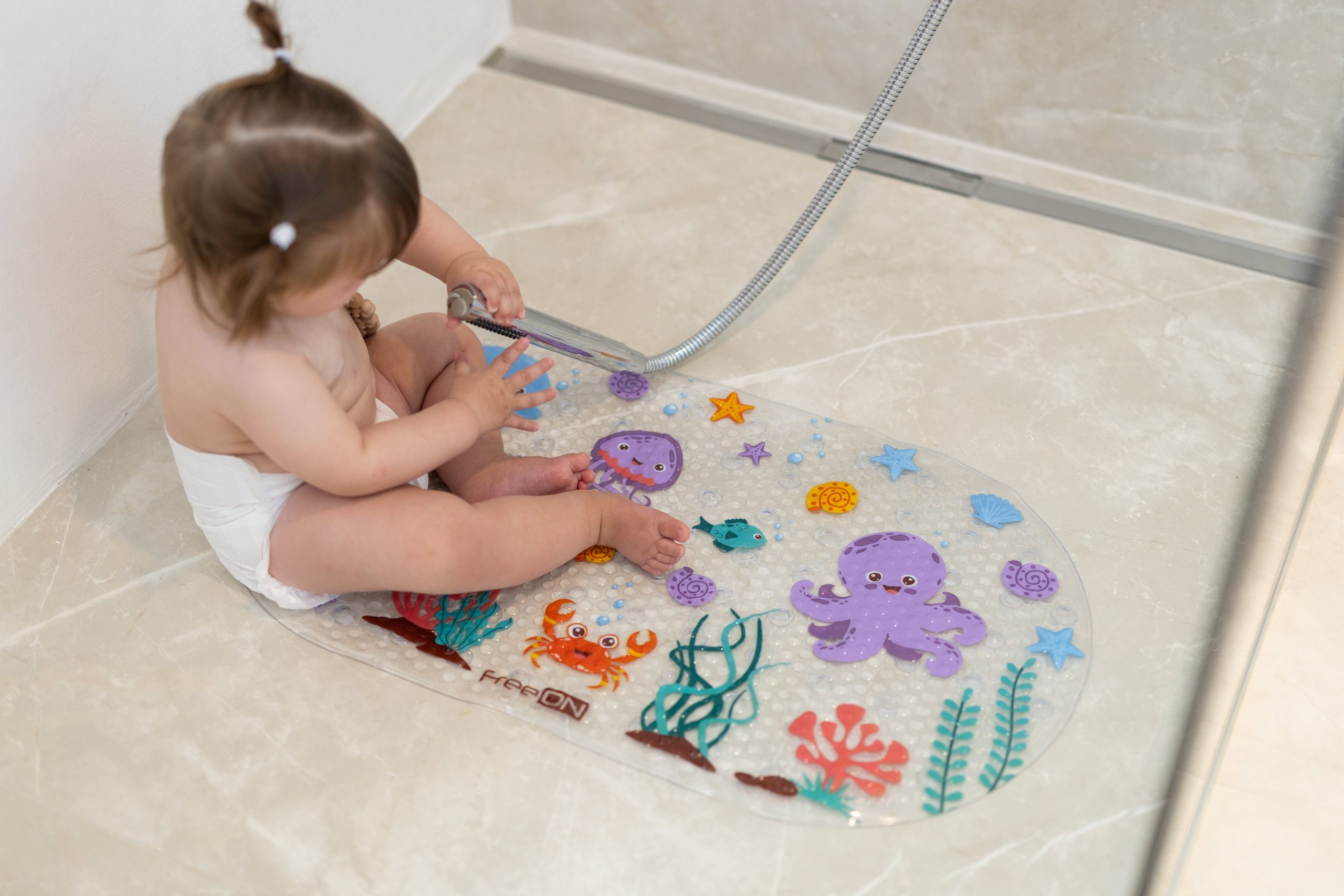 Il tappetino antiscivolo dotato di speciali ventose sul fondo è stabile e non scivola, garantendo così al bambino un bagno sicuro.