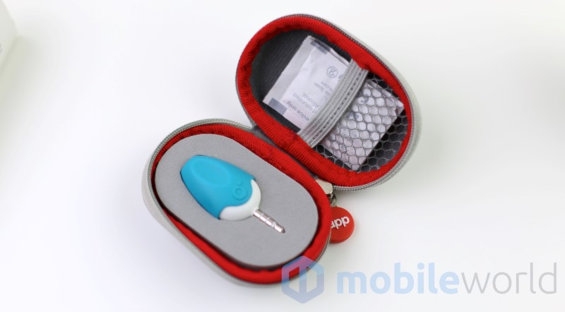 La confezione include il termometro, una custodia per il trasporto, 4 salviette monouso per la pulizia del sensore ed il manuale d’uso anche in italiano. Il termometro ha delle dimensioni di 50 x 24 x 18 mm ed ha un peso di 22 grammi. È composto totalmente in plastica rigida e possiede superiormente il sensore per la misurazione, inferiormente il jack da 3,5mm ed ai lati due piccole viti che permettono l’accesso al vano batterie.